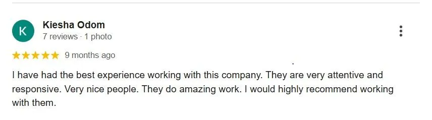 "I have had best experience working with this company. They are very attentive and responsive. Very nice people. They do amazing work. I would highly recommend working with them" - Odom