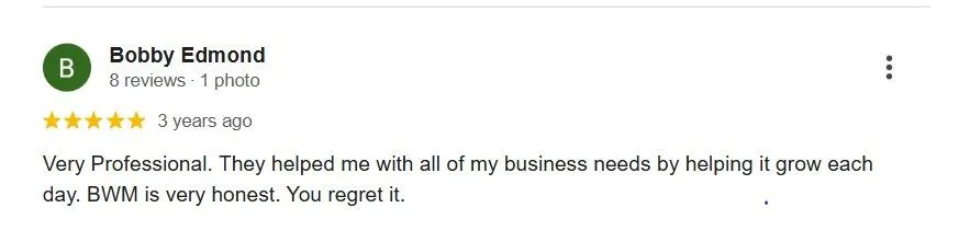 "Very Professional. They helped me with all of my business needs by helping it grow each day. BWM is very honest. You wouldn't regret it." - Bobby Edmond
