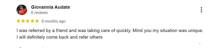 "I was referred by a friend and was taking care of quickly Mind you my situation was unique. I will definitely come back and refer others" - Giovannia